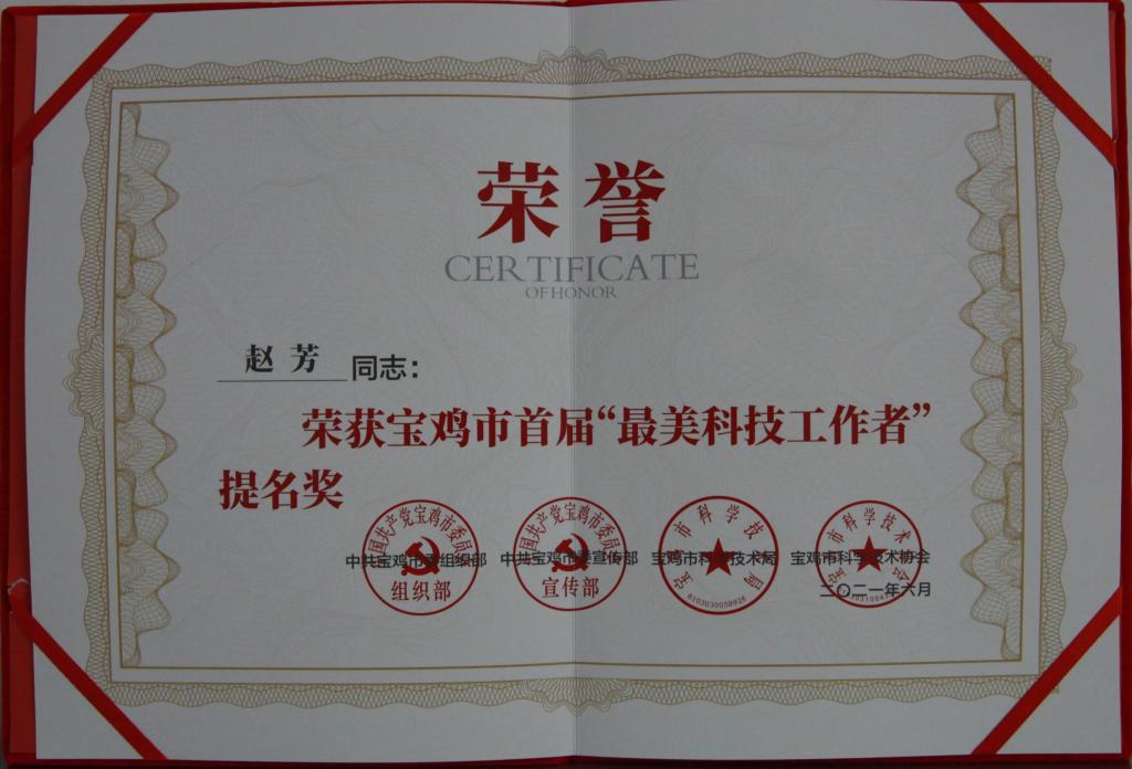 近日,寶光股份趙芳在中共寶雞市委組織部、中共寶雞市委宣傳部、寶雞市科學技術局、寶雞市科學技術協(xié)會聯(lián)合開展的“尋找寶雞最美科技工作者”評比活動中,被授予2021年“優(yōu)秀科技工作者”提名獎。